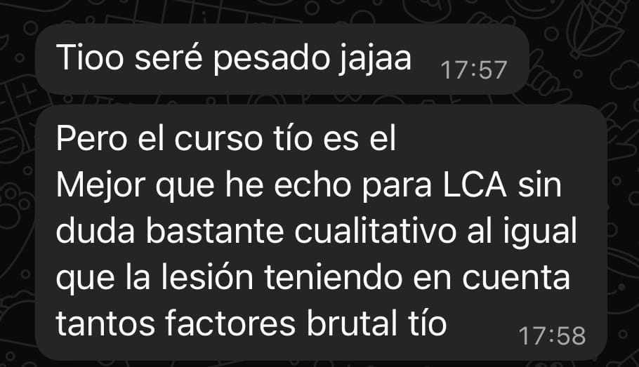 Me he formado con varias escuelas sobre esta lesión... y puedo afirmar que es el curso de LCA más completo que hay en el mercado y lo avalan los resultados con más de 400 rodillas lesionadas de LCA y/o menisco.